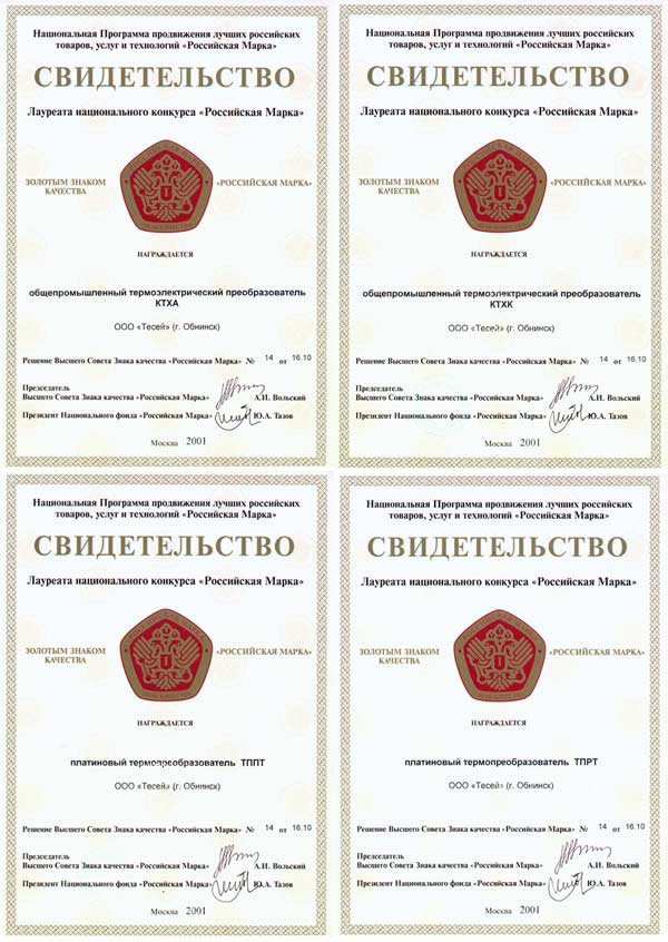 Четыре вида продукции компании - кабельные термопреобразователи КТХА, КТХК и платиновые термопреобразователи ТППТ, ТПРТ удостоены Золотого Знака качества "Российская Марка".