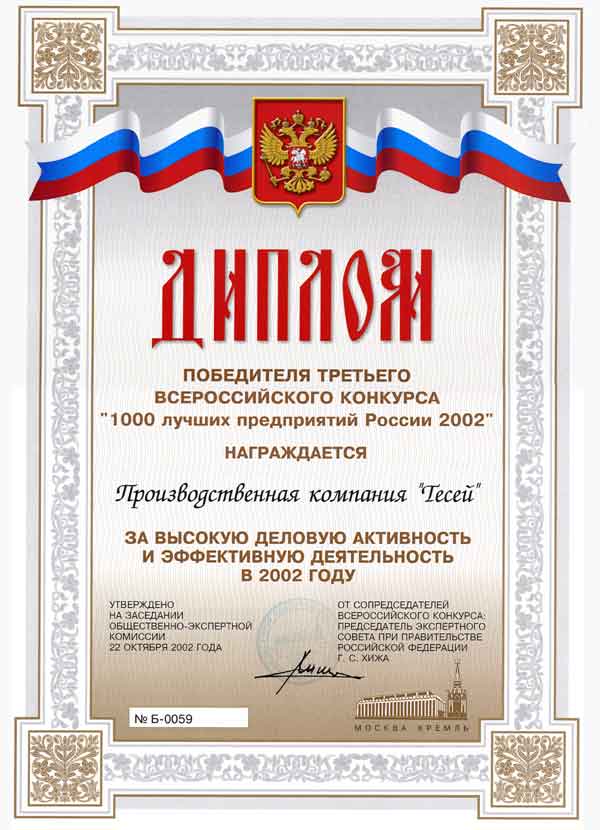 Победитель Всероссийского конкурса "1000 лучших предприятий России - 2002".