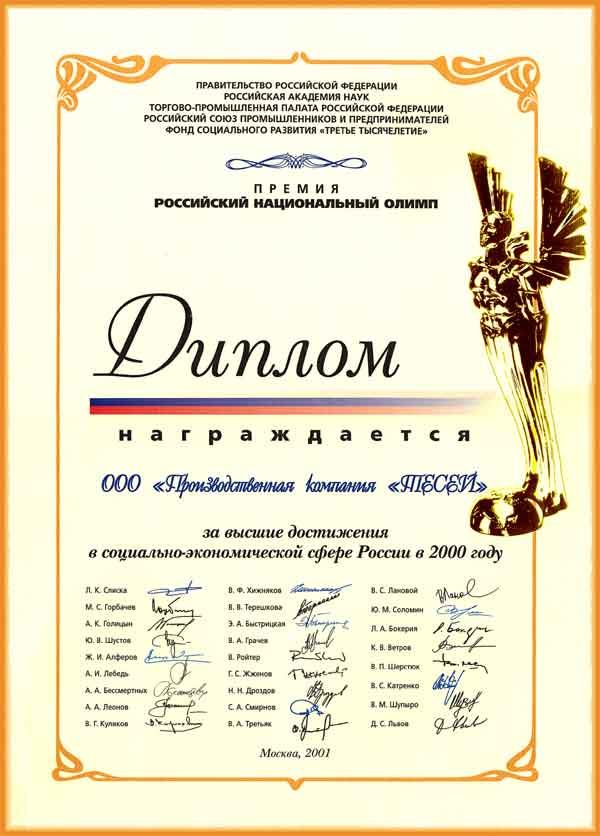 Лауреат национального конкурса "Российская Марка" в рамках Национальной Программы продвижения лучших российских товаров, услуг и технологий "Российская Марка". 2001г.